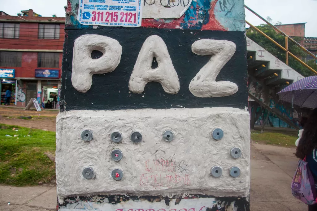 Luego vino Paz, un homenaje al natalicio de Luis Braille, creador del sistema braille. Tres letras que irónicamente forman una palabra que se escribe con balas. Lo que es una “distopia”, señala Báez, ubicado junto a uno de los pilares del Puente de la Dignidad, donde se hizo esta obra.