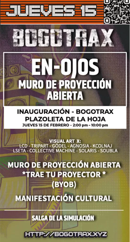 La primera parada del festival será en la Plazoleta de la Hoja, en la carrera 32 No 19A-39, desde las 2 de la tarde hasta las 10 de la noche. Y contará con el muro de proyección abierta: En-Ojos, en el que también participarán los artistas visuales: Hakk, LCD, Tripart, Mireaver, Gödel, Agnosia, Kcolnaj, Collective Machine y Soubla, entre otros.