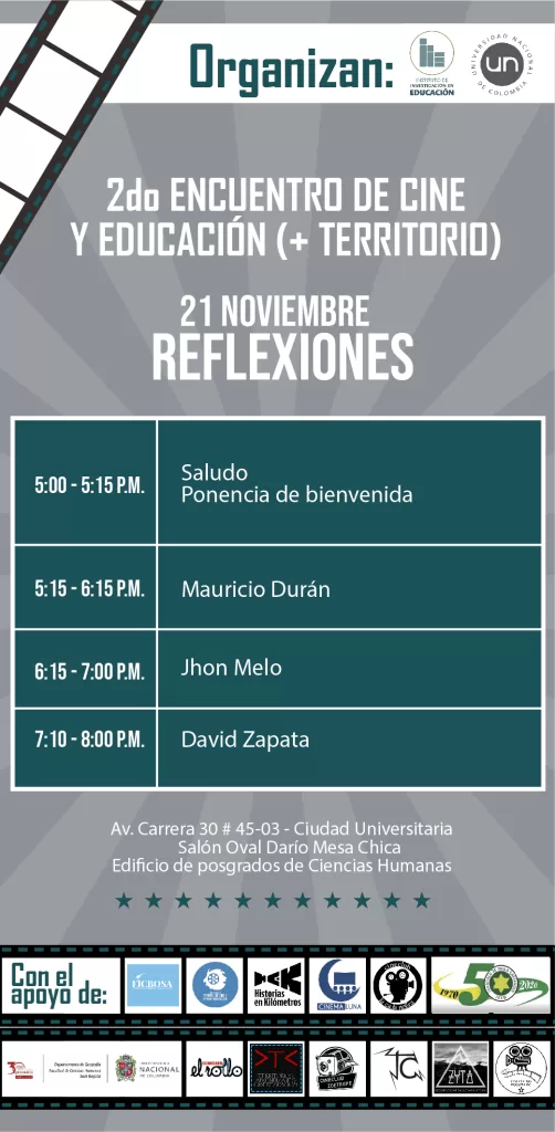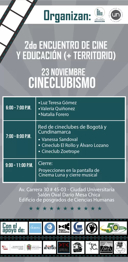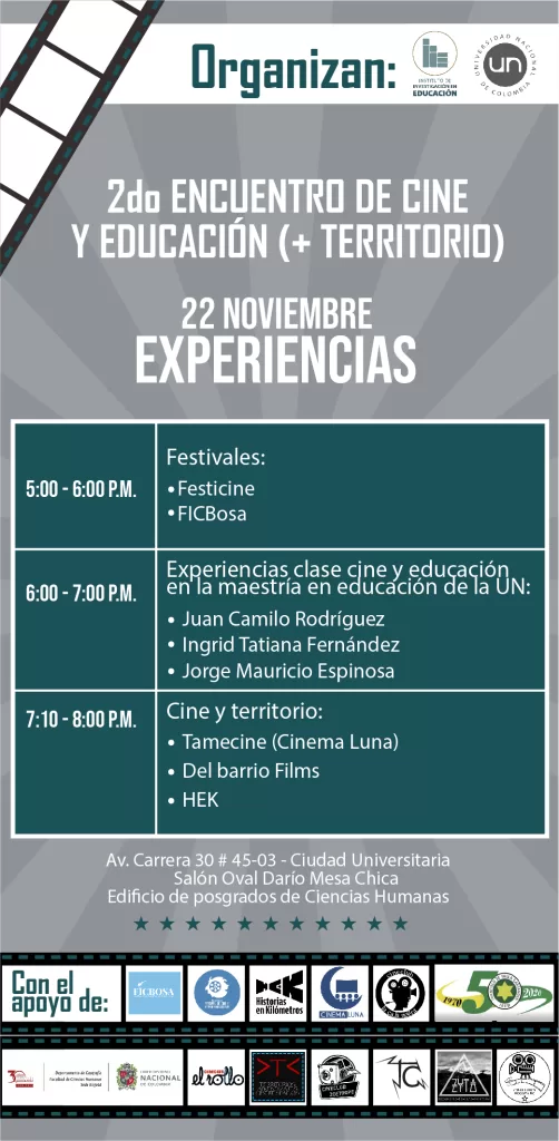 Desde el 21 hasta el 23 de noviembre se realizará en la Universidad Nacional el Segundo Encuentro de Cine y Educación (+ Territorio). Un evento que reúne en un solo lugar a creadores de festivales de cine, cineclubes y educadores interesados en el séptimo arte, para hablar sobre su importancia y su relación con la educación cinematográfica y los territorios en Colombia.