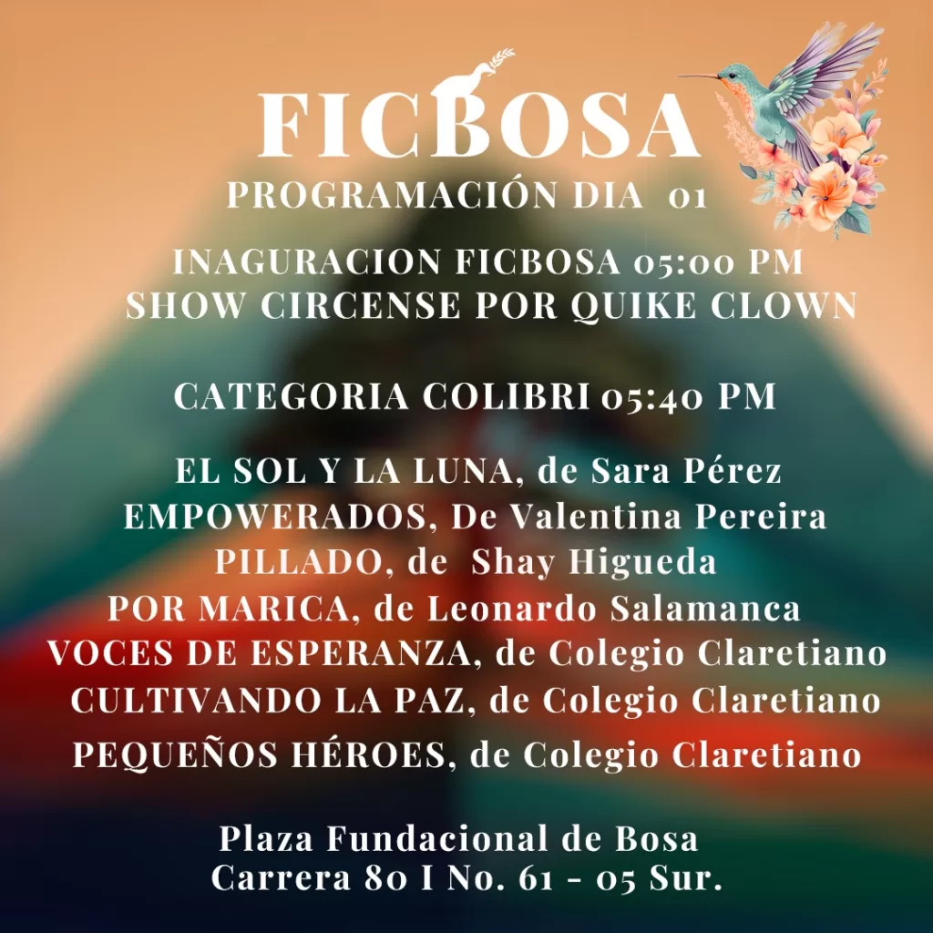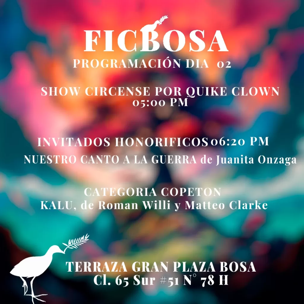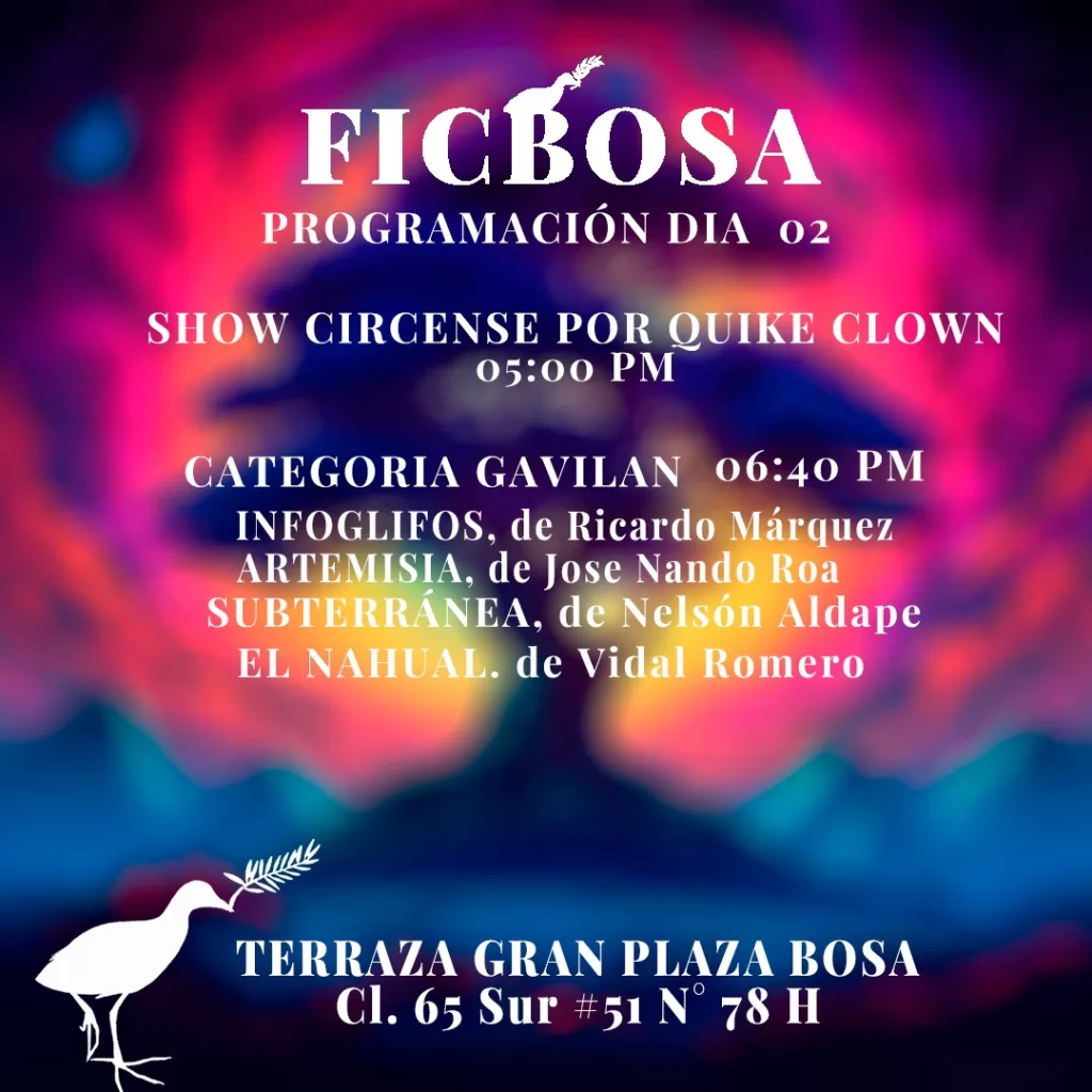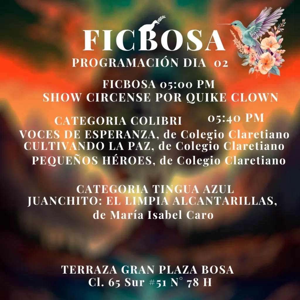 Al otro día, el viernes 22, también habrá espectáculo de circo desde las cinco de la tarde, pero este será en la terraza del Centro Comercial Gran Plaza en Bosa. Un espacio que recibirá los cortometrajes producidos por estudiantes del Colegio Claretiano, donde el FICBosa dictó talleres de cine, literatura y podcast.