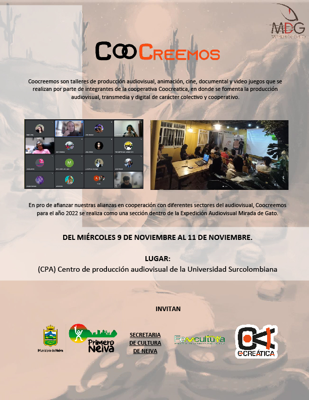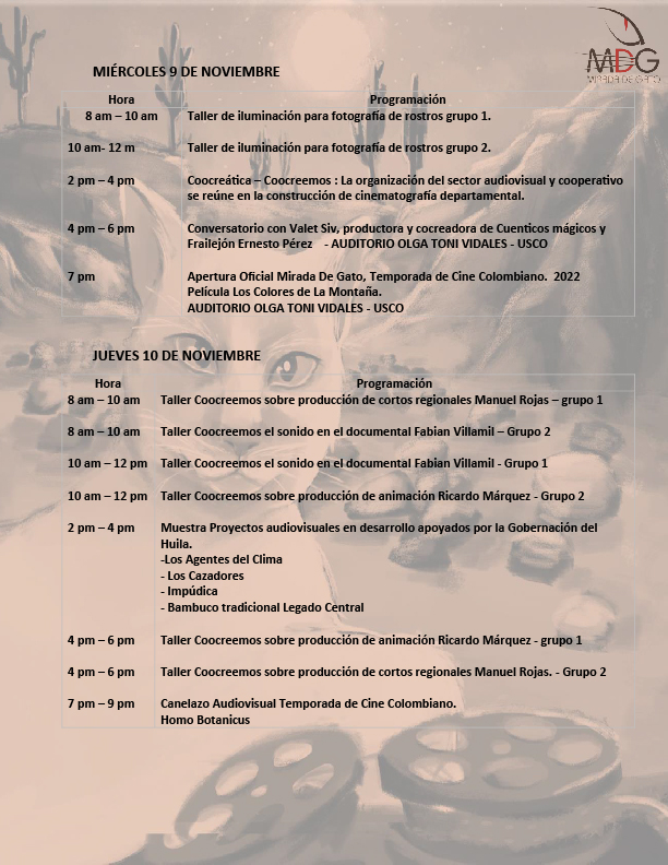 Mirada de Gato, que comenzó oficialmente el 9 de noviembre en la Universidad Surcolombiana con talleres de iluminación, charlas de cine y la muestra de la película: Los colores de la montaña, “es un evento que vincula a la comunidad académica de la Universidad Surcolombiana, principalmente a estudiantes de Comunicación Social y Periodismo, pero también es una iniciativa de un colectivo vinculado al sector audiovisual y cinematográfico del departamento del Huila”, nos cuenta Fernando Charry, coordinador de Mirada de Gato 2022 y docente de la Universidad.