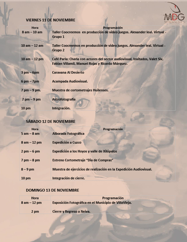 Al otro día, el sábado, habrá una alborada fotográfica hacía tres de los lugares más emblemáticos del Desierto de la Tatacoa: Cuzco, El Congreso de los Fantasmas y El Valle de los Xilópalos. Y llegada la noche, el lanzamiento del cortometraje regional: Día de Compras.