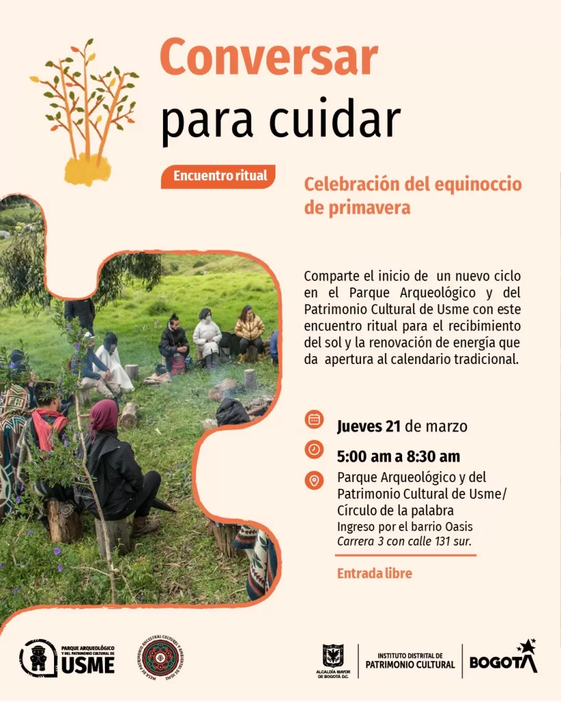Este 21 de marzo, desde las 5 de la mañana, estarán abiertas las puertas del Parque Arqueológico de Usme, para celebrar el equinoccio de primavera. Un evento gratuito organizado po la Mesa de Patrimonio Usmeka, para profundizar en la memoria social, tradición oral y defensa rural de la localidad.