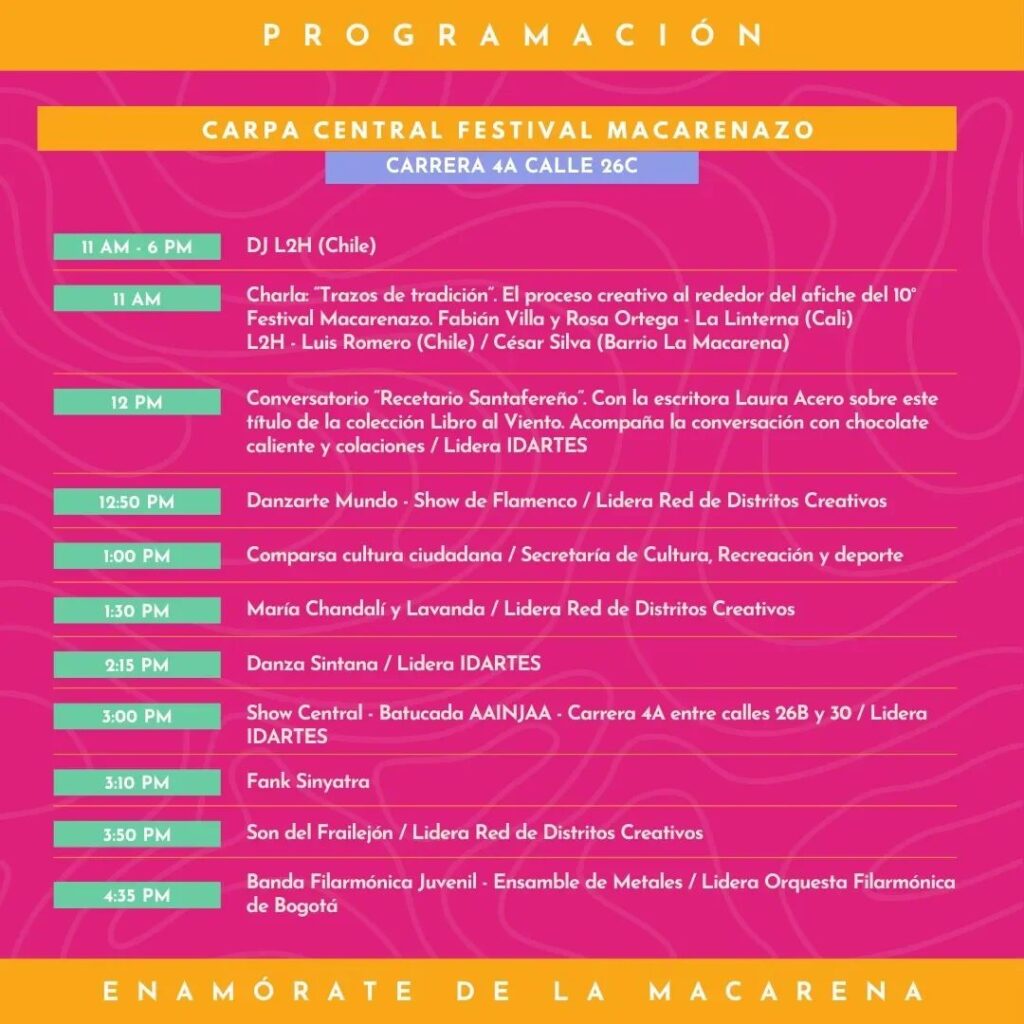 “El Festival El Macarenazo es un claro ejemplo de cómo los eventos culturales pueden fortalecer los territorios y enriquecer la identidad de nuestra ciudad. Estos encuentros no solo celebran la riqueza cultural del Distrito Creativo Centro Internacional, sino que también juegan un papel crucial en la dinamización económica y social de los barrios”, señaló, Santiago Trujillo, Secretario de Cultura, Recreación y Deporte de Bogotá.
