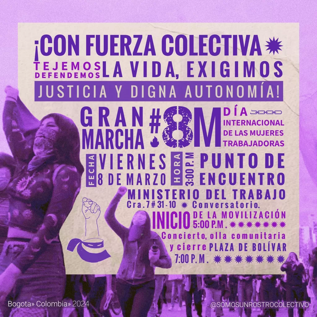 Este viernes 8 de marzo se conmemora el Día Internacional de la Mujer, una fecha que se ha convertido en símbolo de las luchas femeninas en el mundo. Y en Bogotá, los colectivos feministas y organizaciones sociales, que trabajan día a día con el propósito de garantizar una vida digna y autónoma para todas las mujeres, celebrarán el 8M con manifestaciones en diferentes puntos de la ciudad. Conozca cuáles, aquí.