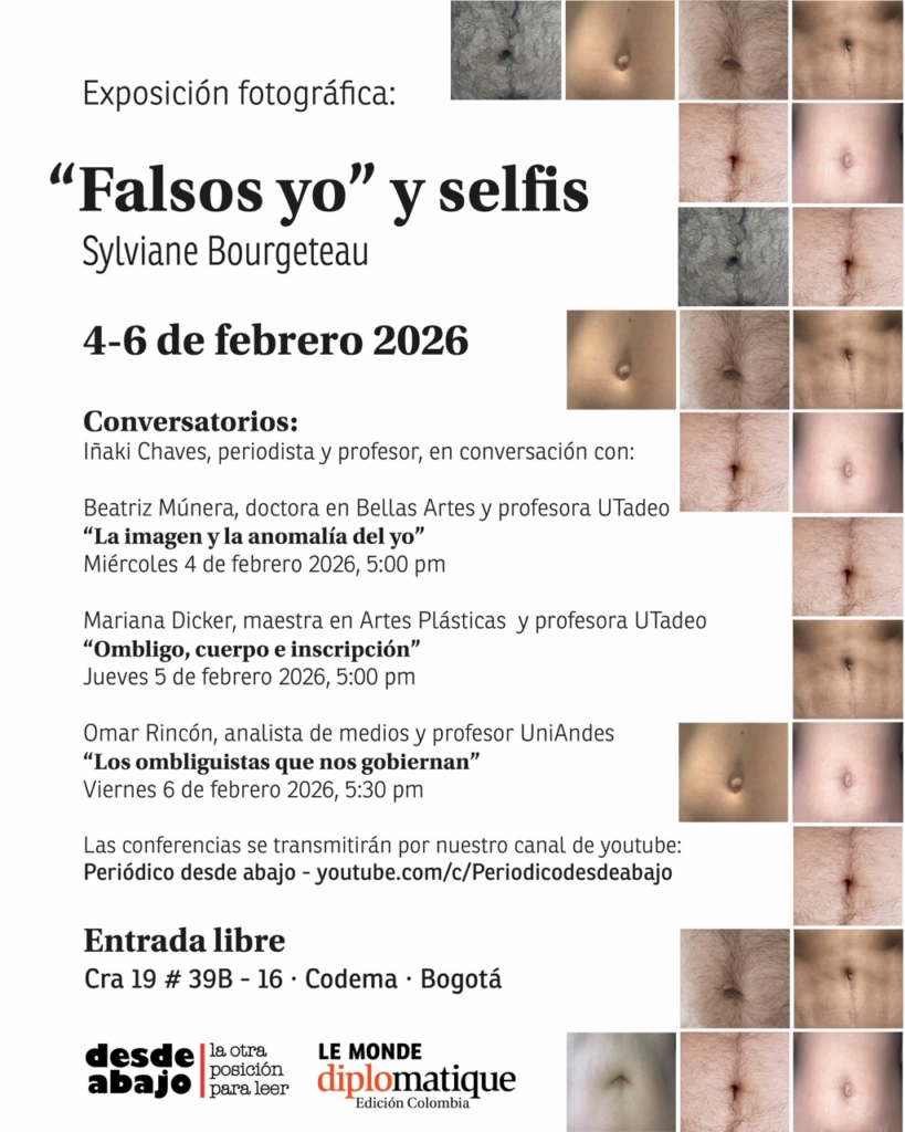 Hasta el 6 de febrero estará abierta: Falsos yo y selfis, una exposición fotográfica de la periodista francesa radicada en Colombia, Sylvianne Bourgeteau, que explora a través de fotografías de ombligos una crítica y reflexión sobre el uso de las redes sociales enfocado a la vanidad, el personalismo, y la falsa identidad del yo.