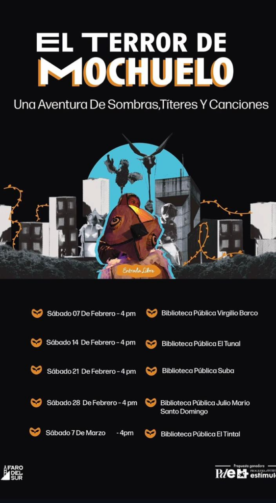 La compañía Faro del Sur, agrupación teatral de Ciudad Bolívar, realiza este mes la circulación de su obra “El terror de Mochuelo” en las bibliotecas públicas de Bogotá. Las funciones, de entrada libre y con el apoyo de la Beca LEP de circulación de espectáculos escénicos CEFE–BibloRed, llevarán al público familiar una puesta en escena que combina títeres, sombras y música colombiana.