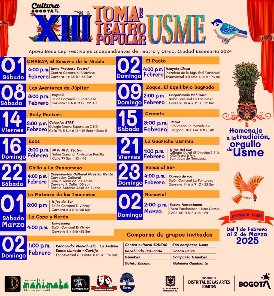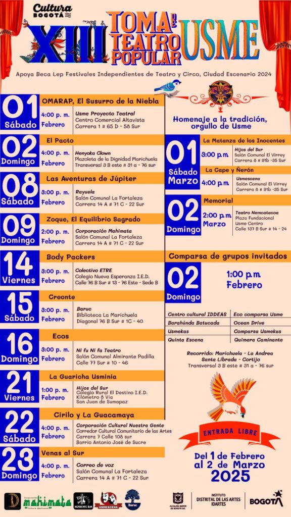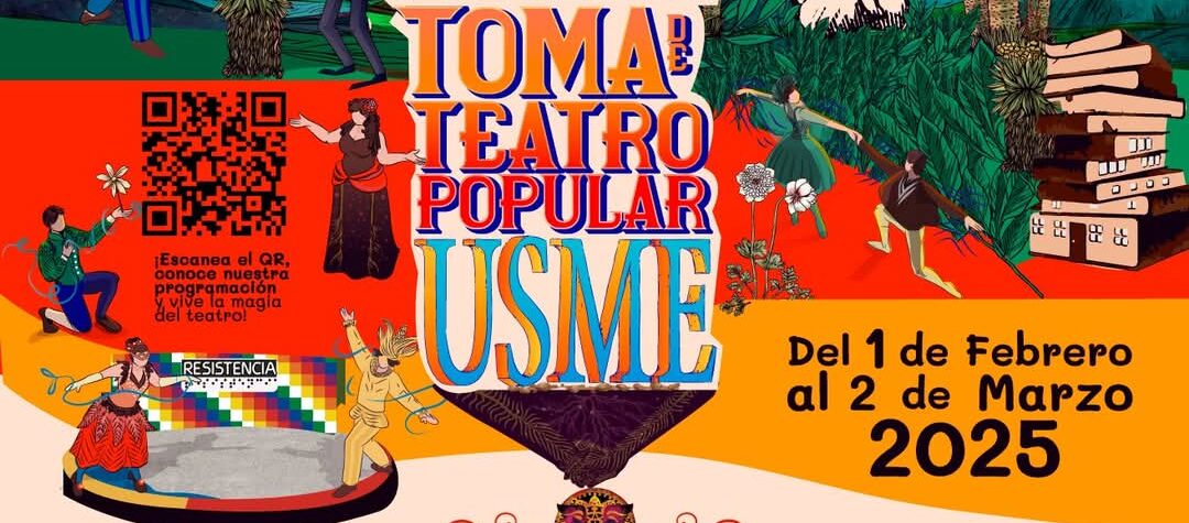 La Toma de Teatro Popular es un festival organizado por la Red Teatral de Usme, conformada por los grupos Usmescena, Usme Proyecto Teatral, la Corporación Mahimata, los grupos Hijos del Sur y Baruc. Destacando que para realizar esta versión, contó con apoyo de la Beca Lep Festivales Independientes de Teatro y Circo, Ciudad escenario 2024.