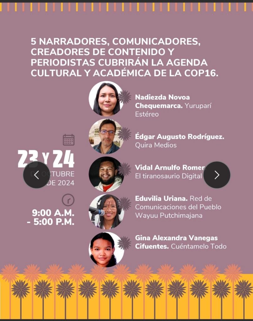 Los medios comunitarios seleccionados para la mesa redonda: El Tiranosaurio Digital, Quira Medios, Yuruparí Estéreo, Red de Comunicaciones del Pueblo Wayuu Putchimajana y Cuéntamelo Todo. Quienes a su vez forman parte de la estrategia Relatos Necesarios, un proyecto en el que los cinco medios cubren la zona verde de la COP16, en alianza con el Ministerio de las Culturas, las Artes y los Saberes y el Gobierno Nacional.