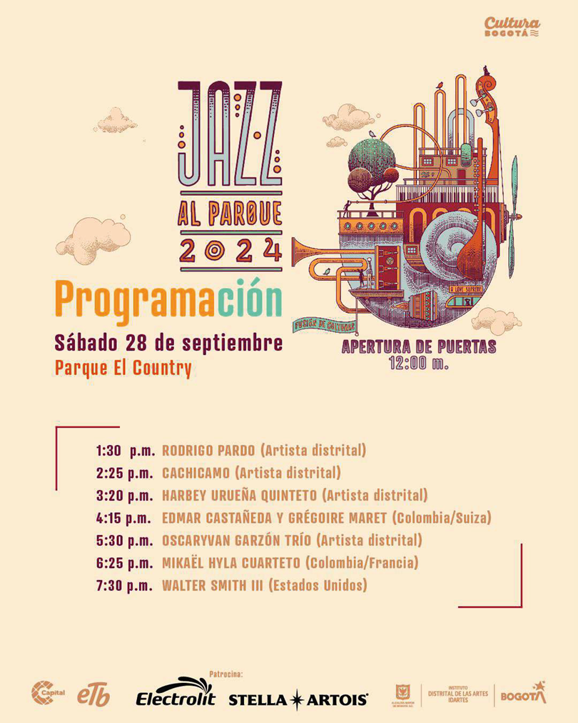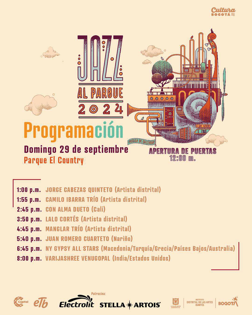 Ocho artistas distritales, cuatro internacionales, tres nacionales, una zona de emprendimientos y un pícnic literario conforman la oferta cultural que habrá este año en el Parque el Country para celebrar una nueva edición del Festival Jazz al Parque 2024.