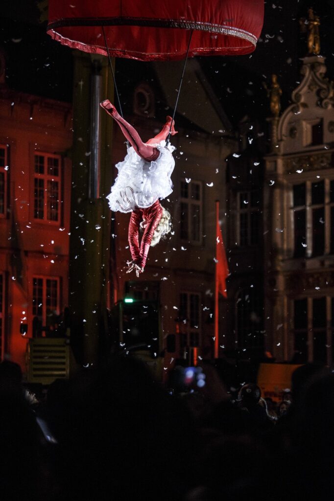 Mismo lugar donde será la clausura, también con entrada libre, pero el 13 y 14 de octubre a las 8 de la noche, con: Muñecas gigantes y los tamborileros aéreos de Transe Express de Francia.