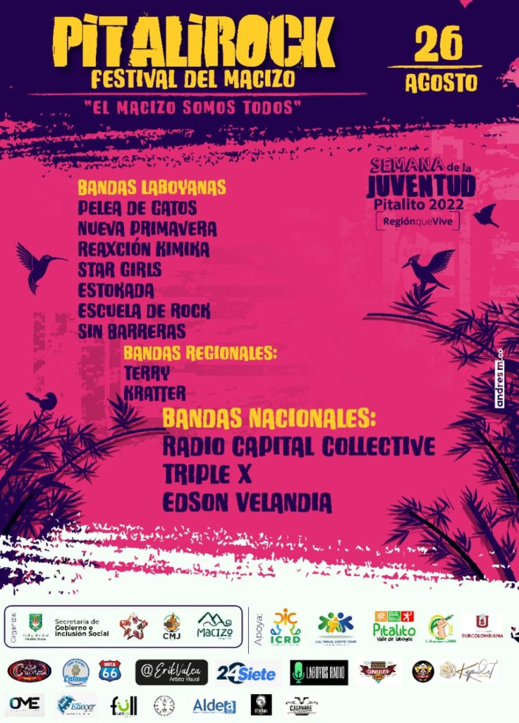 El próximo viernes 26 de agosto se llevará a cabo en Pitalito el festival de rock, Pitalirock 2022: Viva el Macizo. Un evento en el marco de la Semana de la Juventud Laboyana, que rinde un homenaje al Macizo Colombiano, en el que se presentarán una decena de artistas locales, regionales y nacionales.
