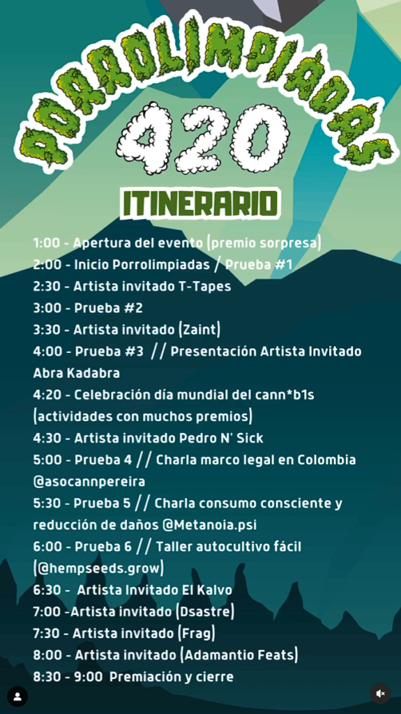 * Olimpiadas cannabicas: competencia en la que buscaremos encontrar al mejor artista cannábico del eje cafetero, para eso tendrán que superar varias pruebas y al final tendremos un podio de ganadores con excelentes premios.