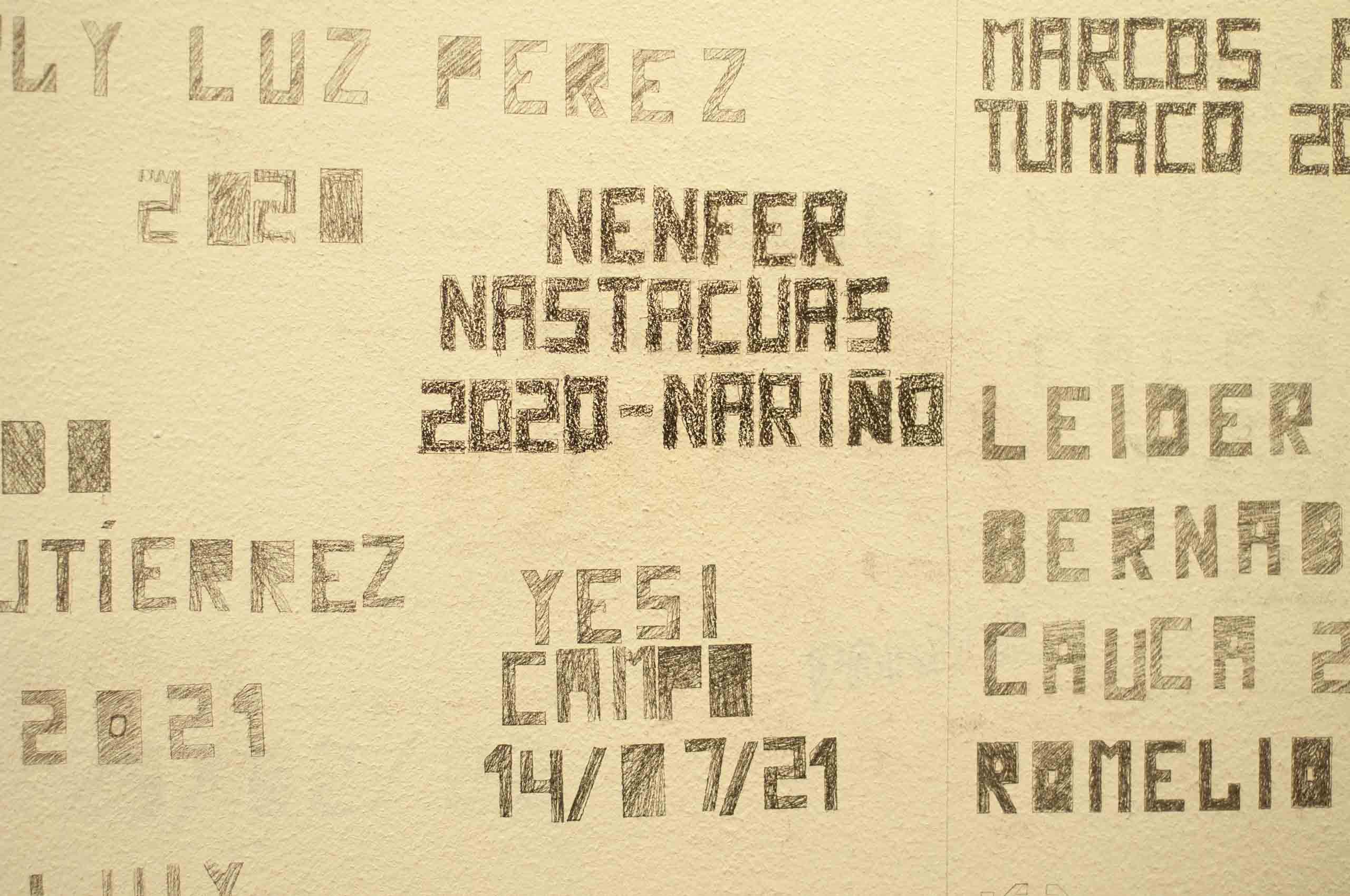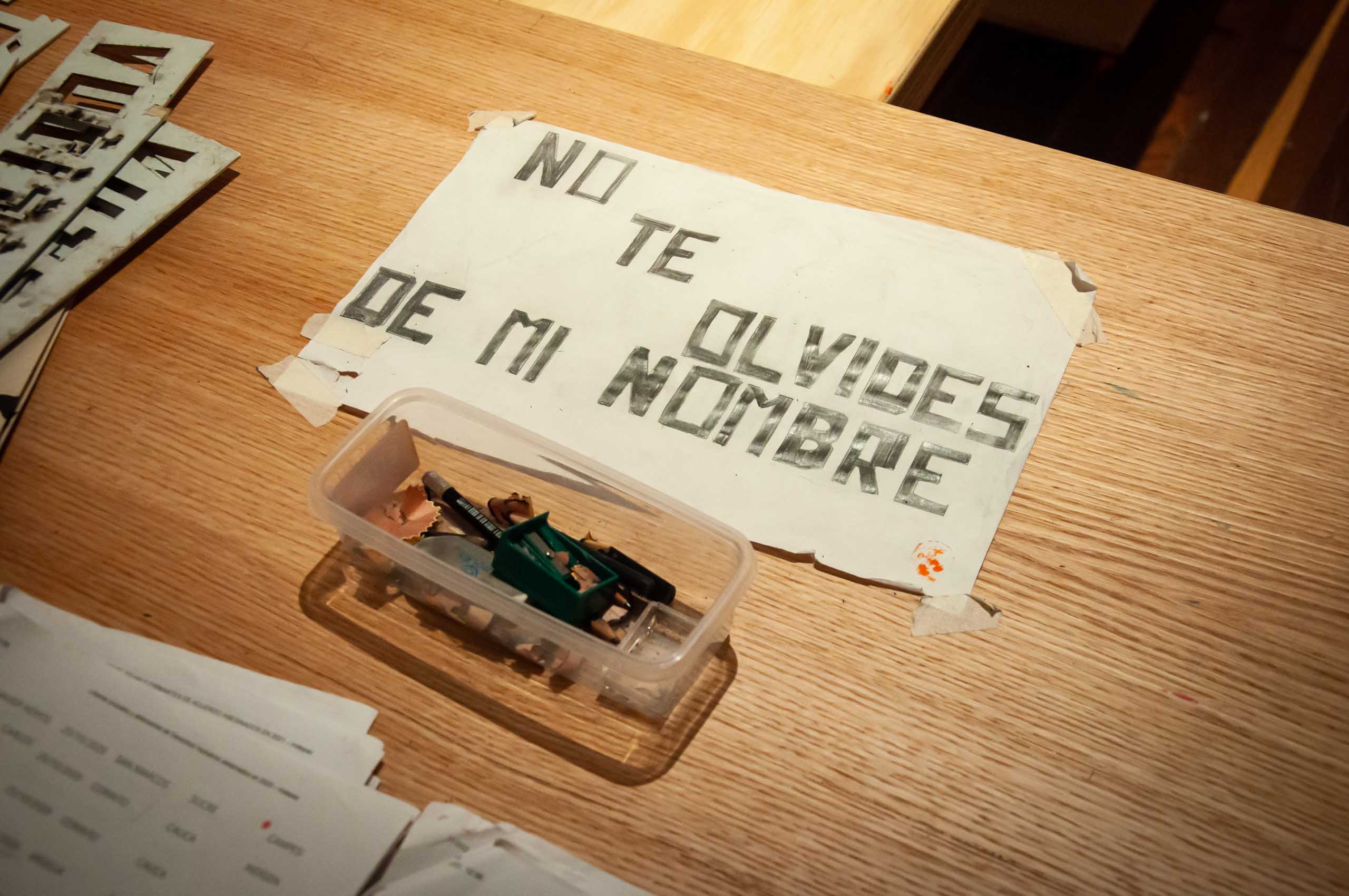 En dieciséis cartulinas, Caro escribe esta frase y la acompaña con los nombres de desaparecidos, entre los que se cuentan líderes estudiantiles, sindicales e indígenas en el marco de las persecuciones políticas de su época. Los participantes podrán escribir los nombres de aquellas personas que consideren que se ajustan a este contexto y hay una lista de líderes sociales asesinados.