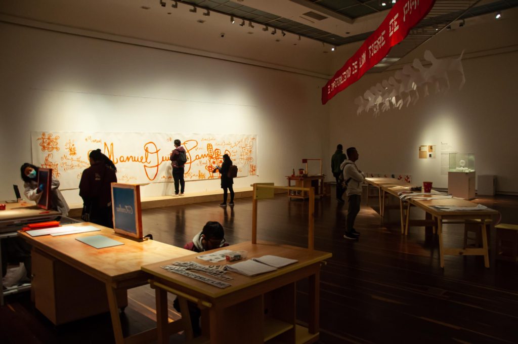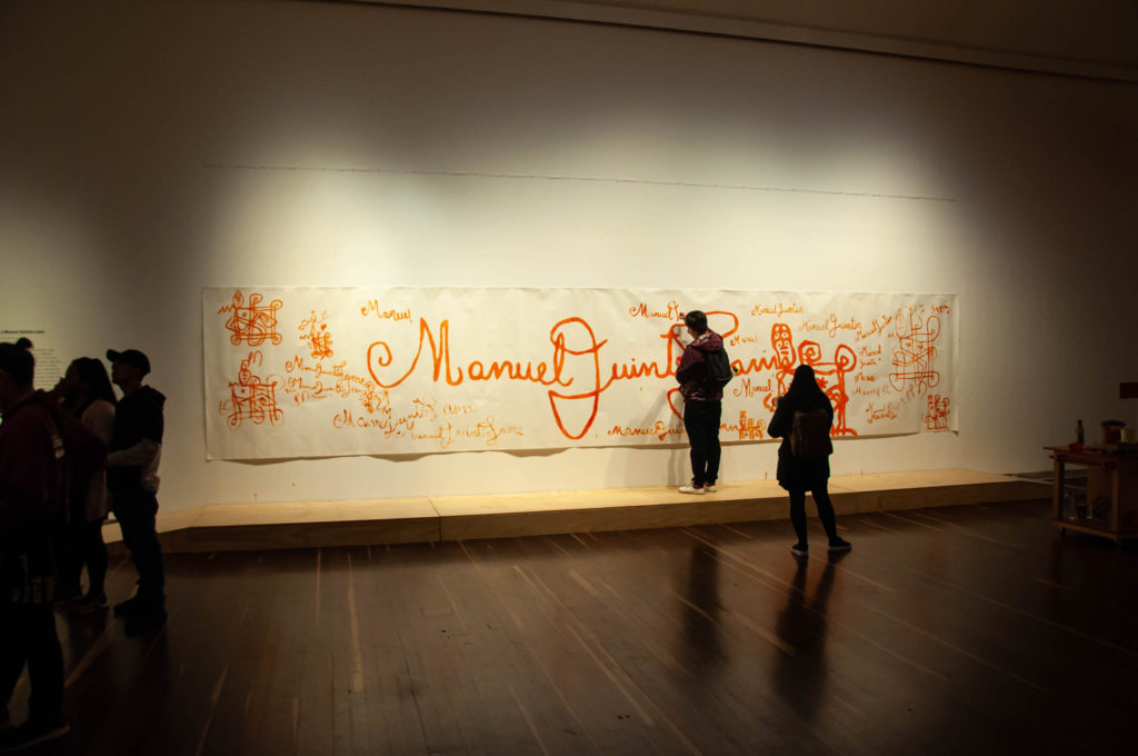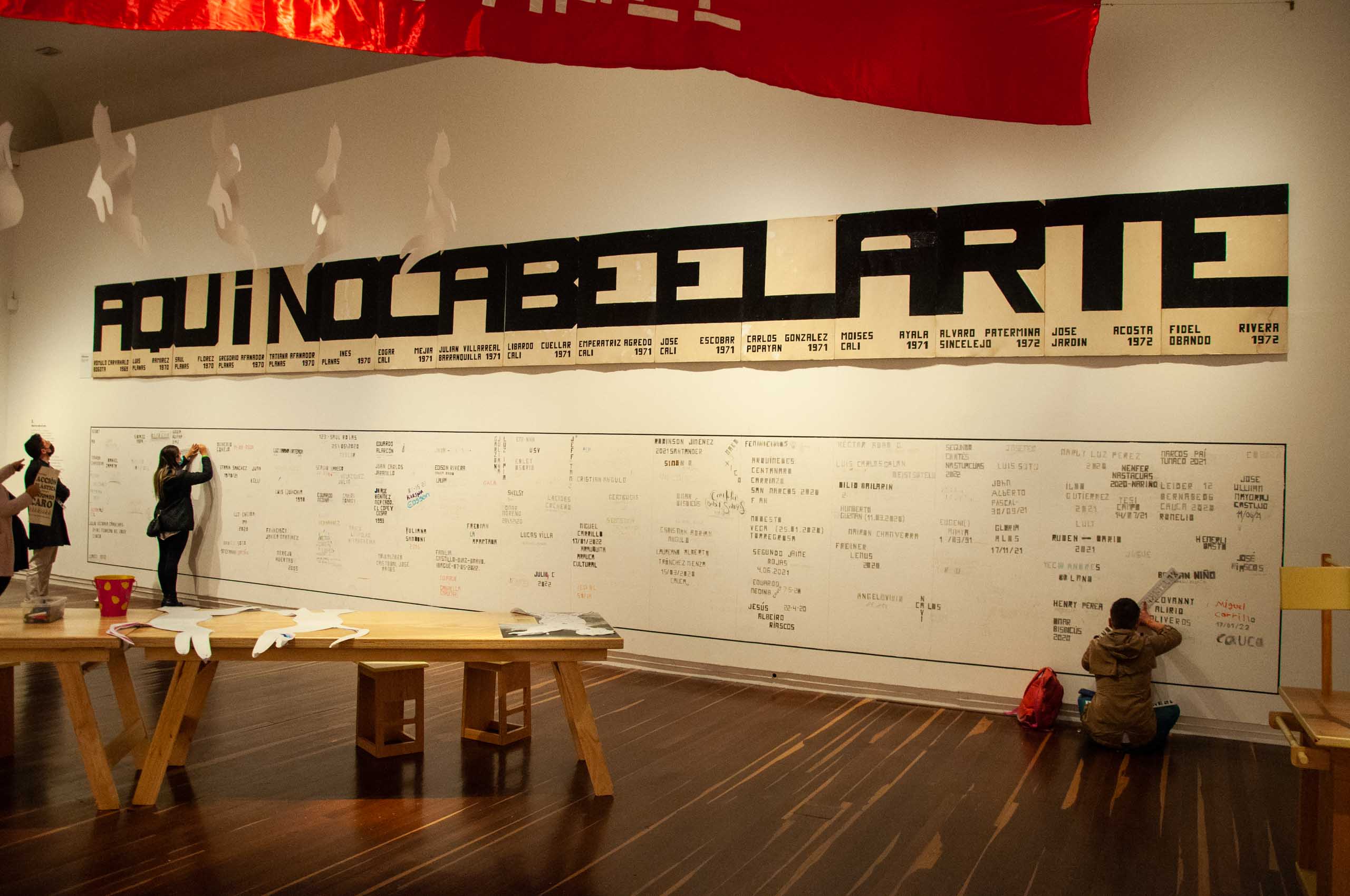 Un papel de al menos 5 metros de largo para copiar la firma del indígena Manuel Quintín Lame, un tigre de papel para pintar con colores, una plantilla de letras para escribir nombres de líderes sociales asesinados, una estatua de sal que se derrite con agua, un kit de serigrafía, una palmada en la pared y varios cuadros de mazorcas es el homenaje a Antonio Caro en el Museo Nacional de Colombia.