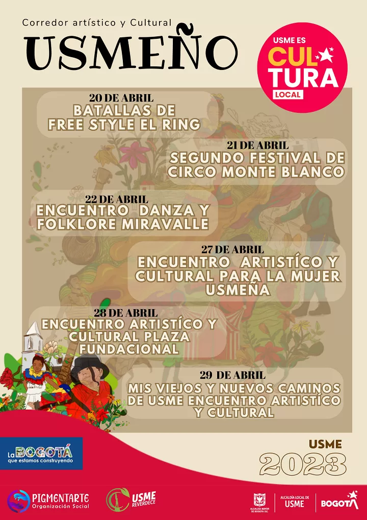 Desde el próximo 20 de abril, hasta el 29 del mismo mes, se realizará en la localidad de Usme el Corredor artístico y Cultural usmeño. Batallas de rap, festival de circo, encuentro de folklore y actividades artísticas y culturales entorno a al futuro de la localidad es lo que vivirá la localidad, beneficiando a más de 80 organización sociales y culturales del territorio.