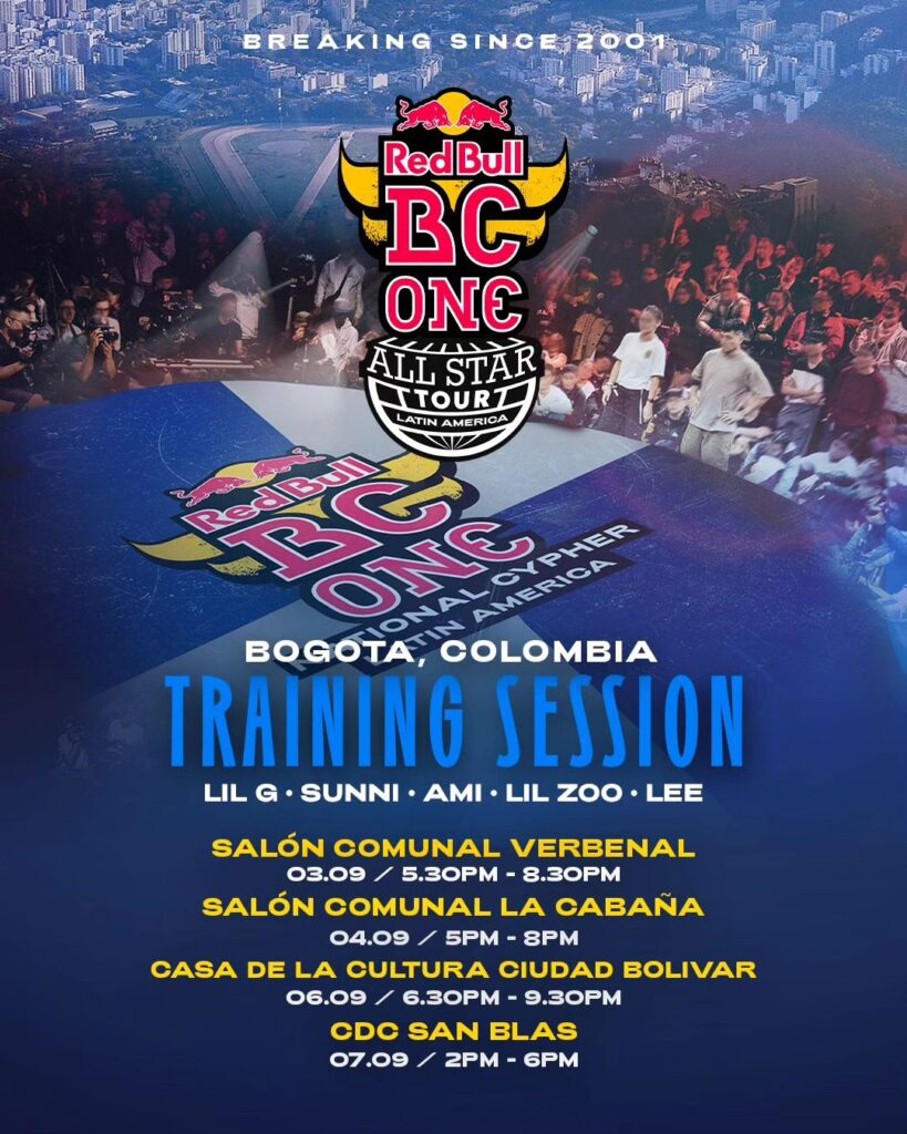 En total las sesiones de entrenamiento serán en cuatro lugares de Bogotá, uno por cada extremo de la ciudad, y entre los invitados estarán las campeonas y campeones de la competencia en diferentes años, incluido el venezolano, Lil G; el británico, Sonni; el marroquí, Lil zoo; el neerlandés, Lee; y la japonesa, Ami. También ganadora de medalla de oro en los Juegos Olímpicos París 2024.