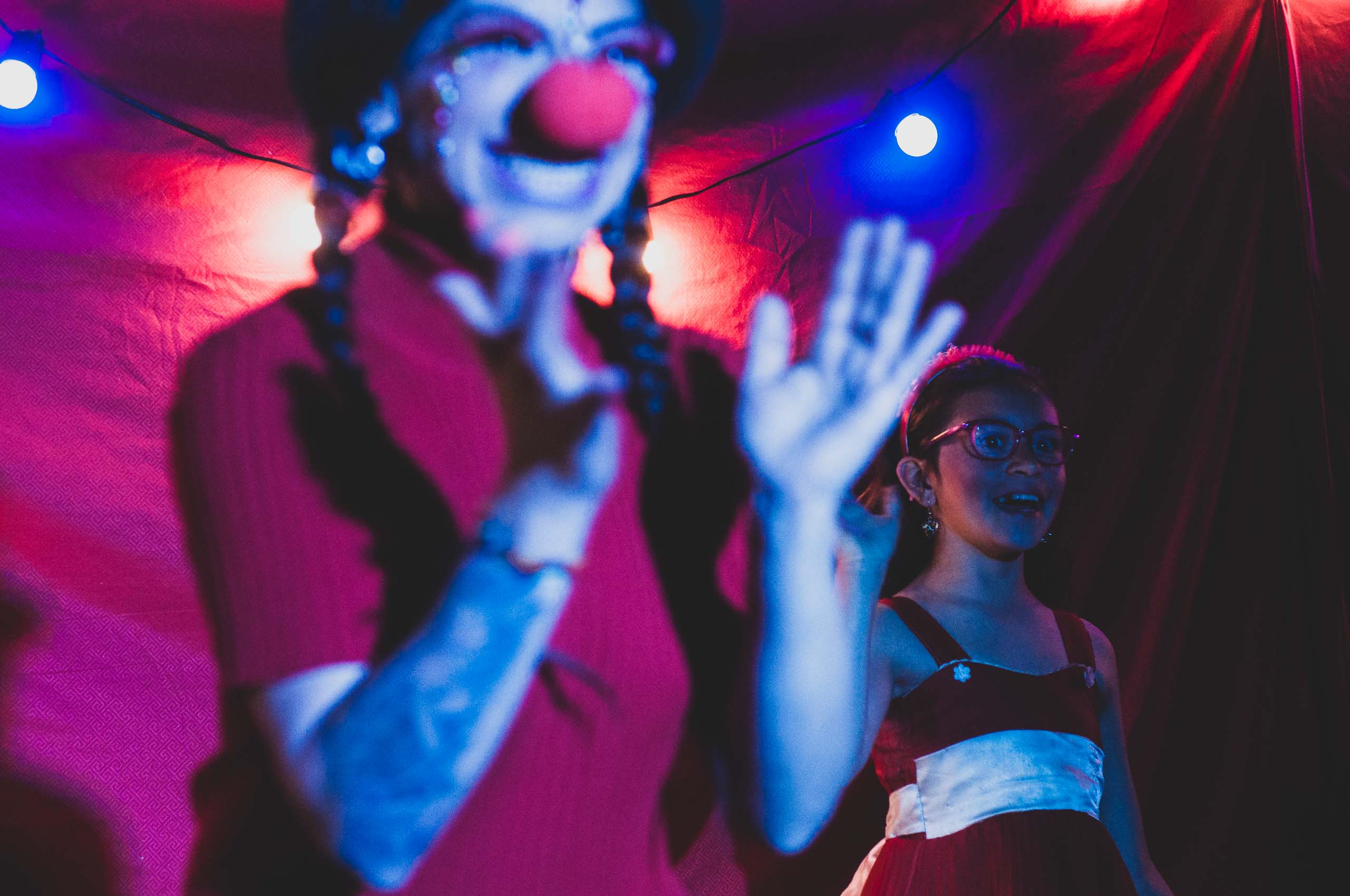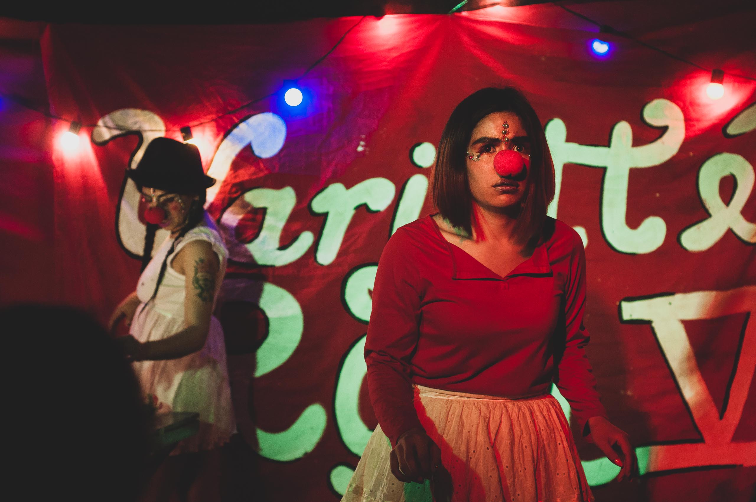 En el más grande de ellos, el Jaime Garzón, fue donde se realizó la quinta Varietté Roja. Y dos payasas, Lelulita y Gotita, las maestras de ceremonias. Una pareja de mujeres payasas, que animaron felizmente a los asistentes durante más de 5 horas.